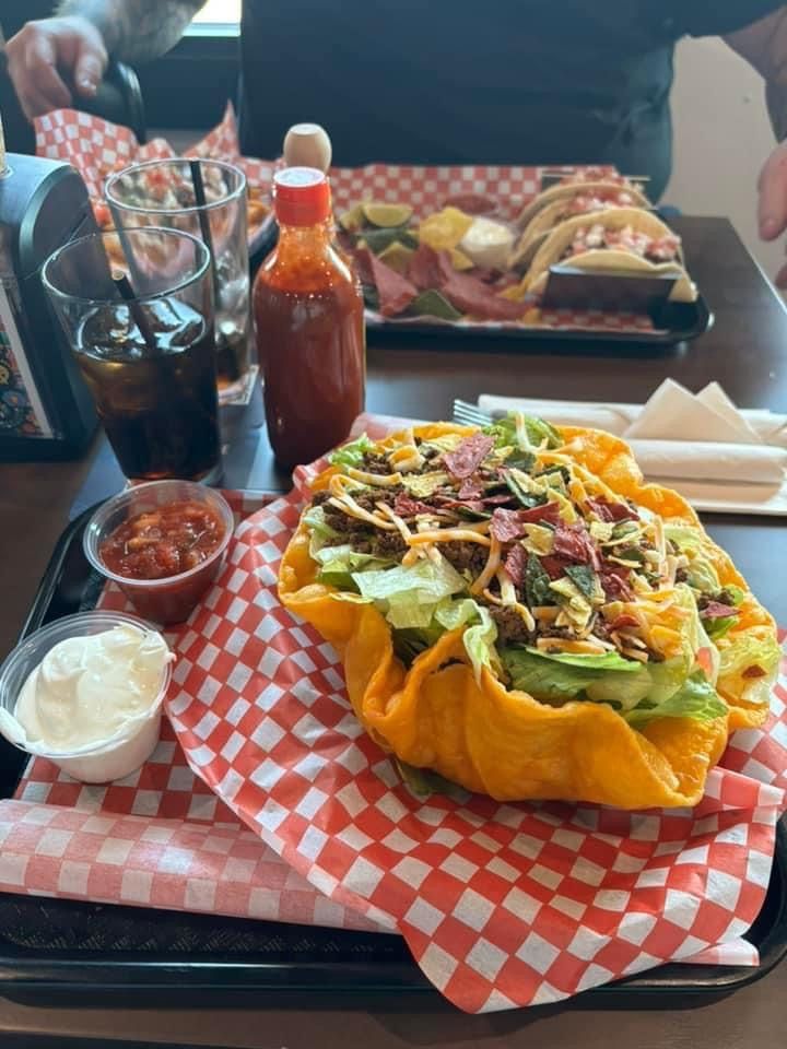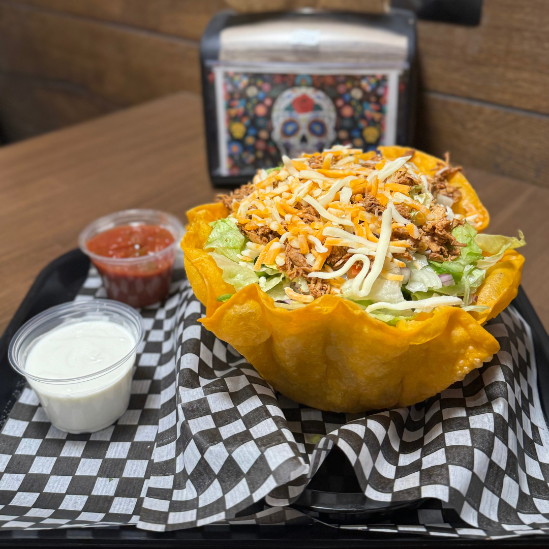 Lettuce, tomato, green pepper, red onion, black olives, jalapenos, choice of meat, Tex-Mex cheese. Salsa & sour cream on the side.