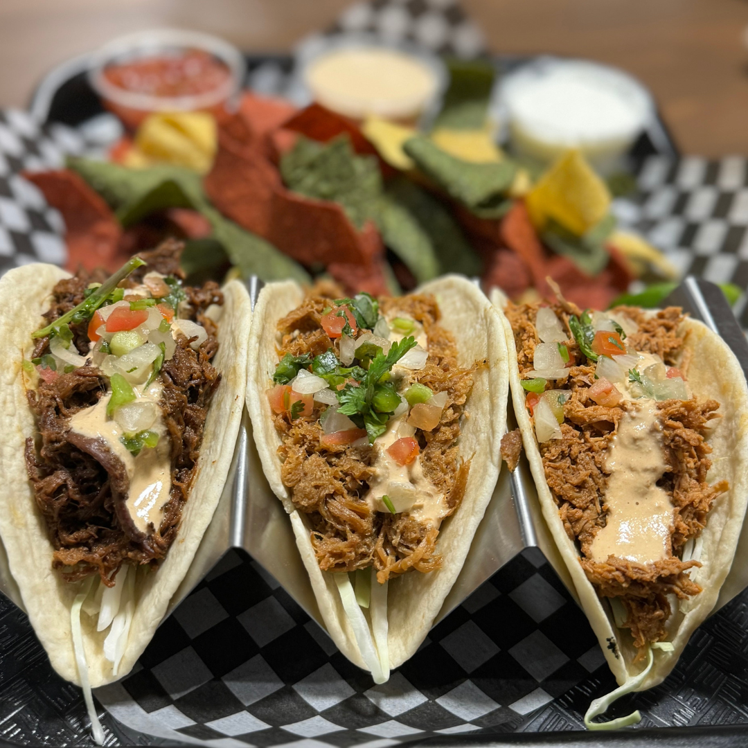 Cabbage, Pico de Gallo, Chaco’s sauce + choice of meat. Served with homemade chips.