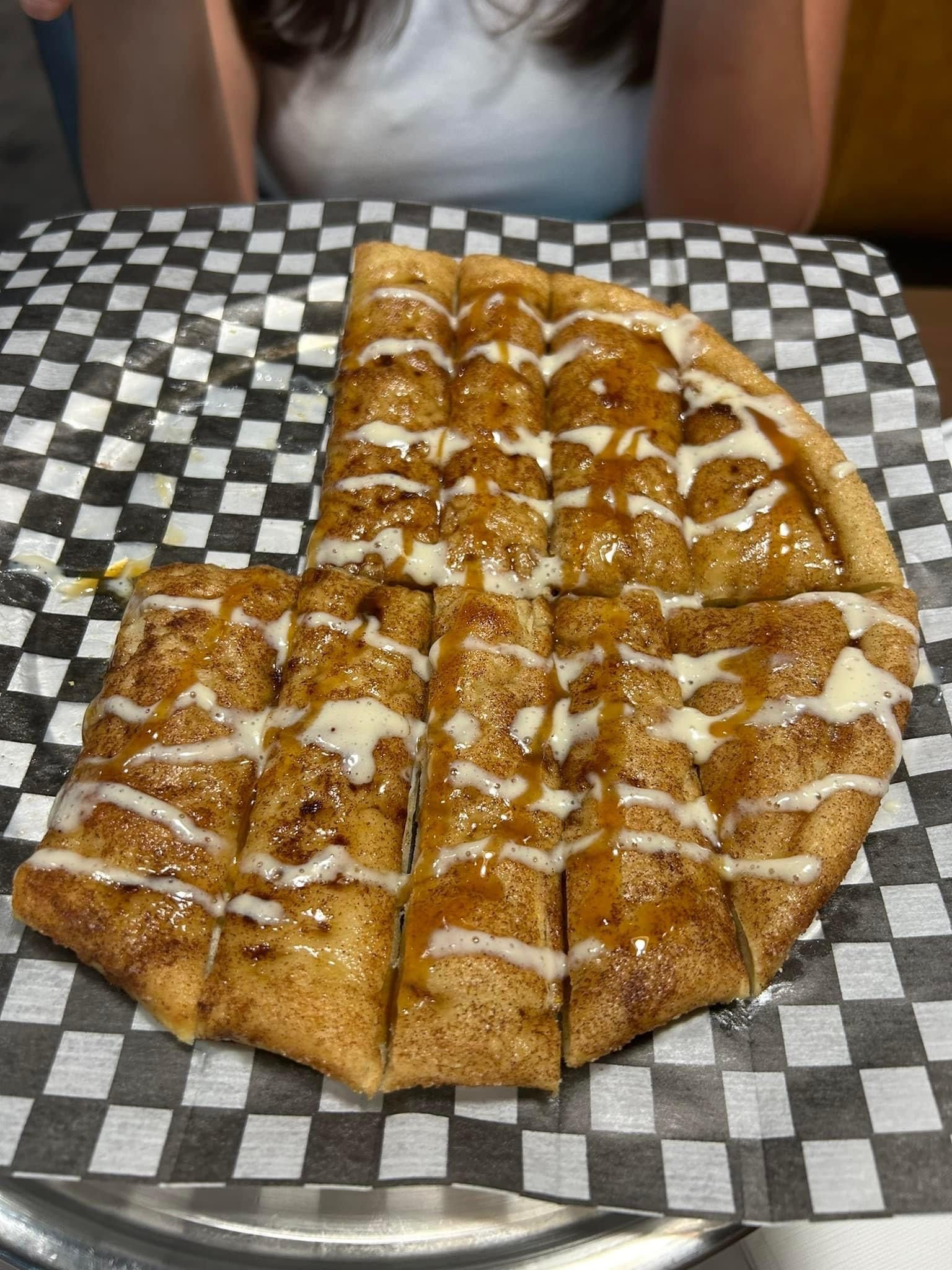 Baked homemade dough topped with cinnamon sugar, caramel, and cream cheese icing.