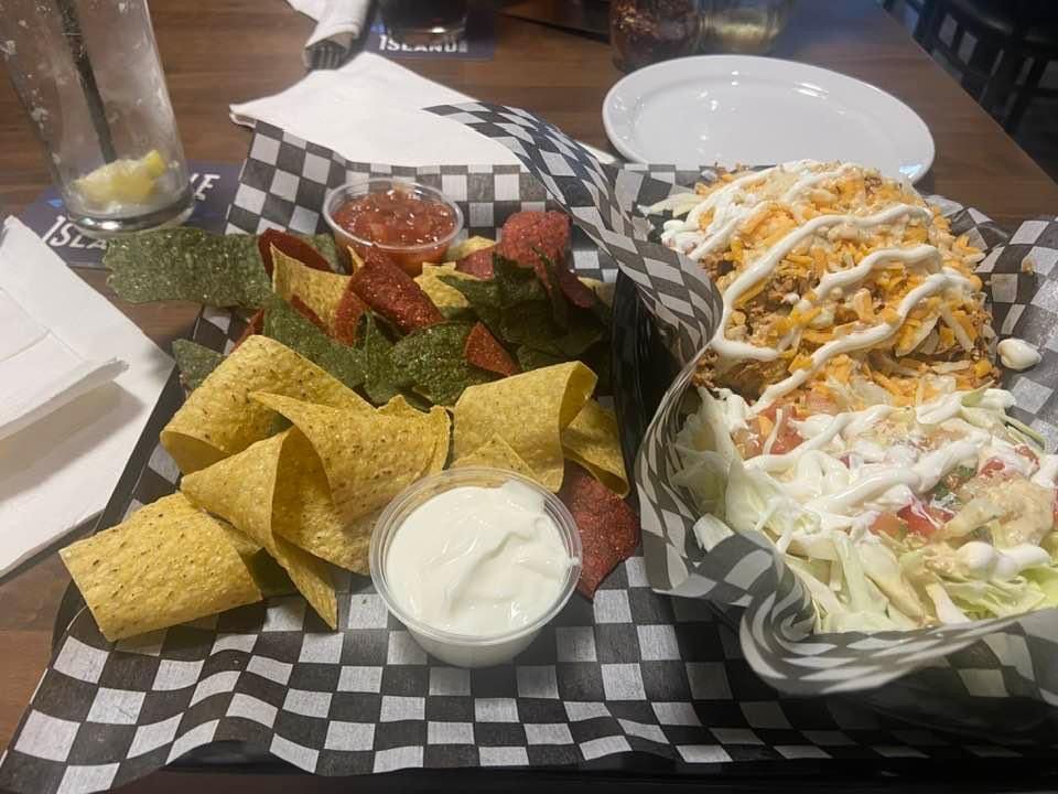 Homemade chips, black olives, jalapenos, red onion, tomato, loaded with Tex-Mex cheese.