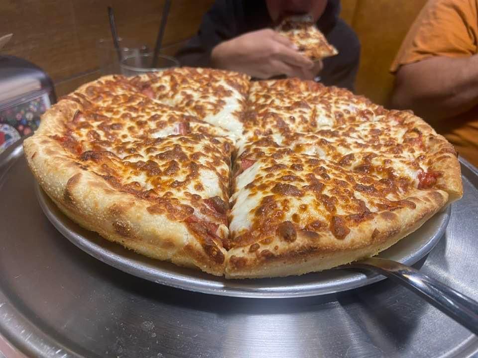 Pizza sauce, smoked ham, pepperoni, sausage, bacon crumble, ground beef and cheese.