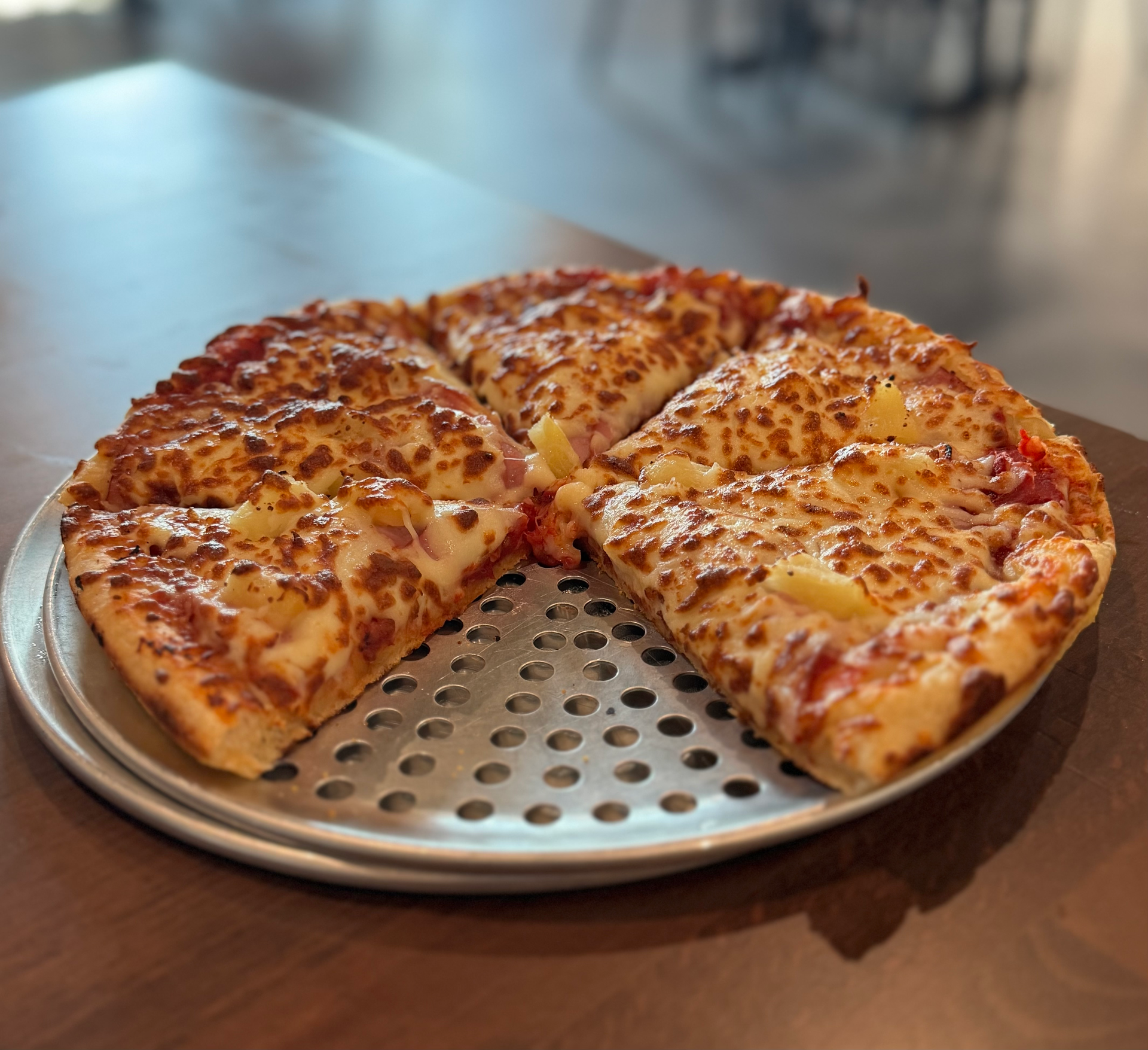Pizza sauce, smoked ham, pineapple and cheese.
